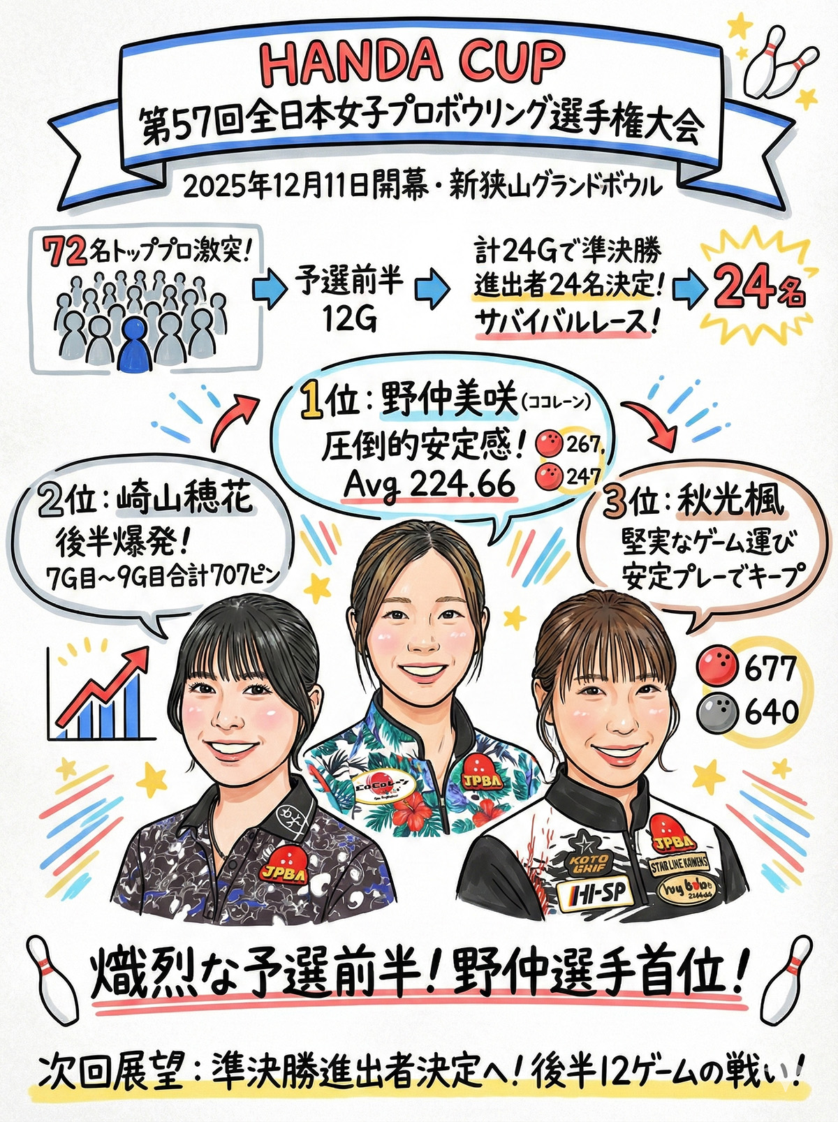 2025年12月11日、埼玉県の新狭山グランドボウルにて「HANDA CUP・第57回全日本女子プロボウリング選手権大会」が開幕しました。公益社団法人日本プロボウリング協会(JPBA)と国際スポーツ振興協会(ISPS)の共催により、今年も国内最高峰の大会が開催され、全国から選ばれた72名のトッププロが激突しています。