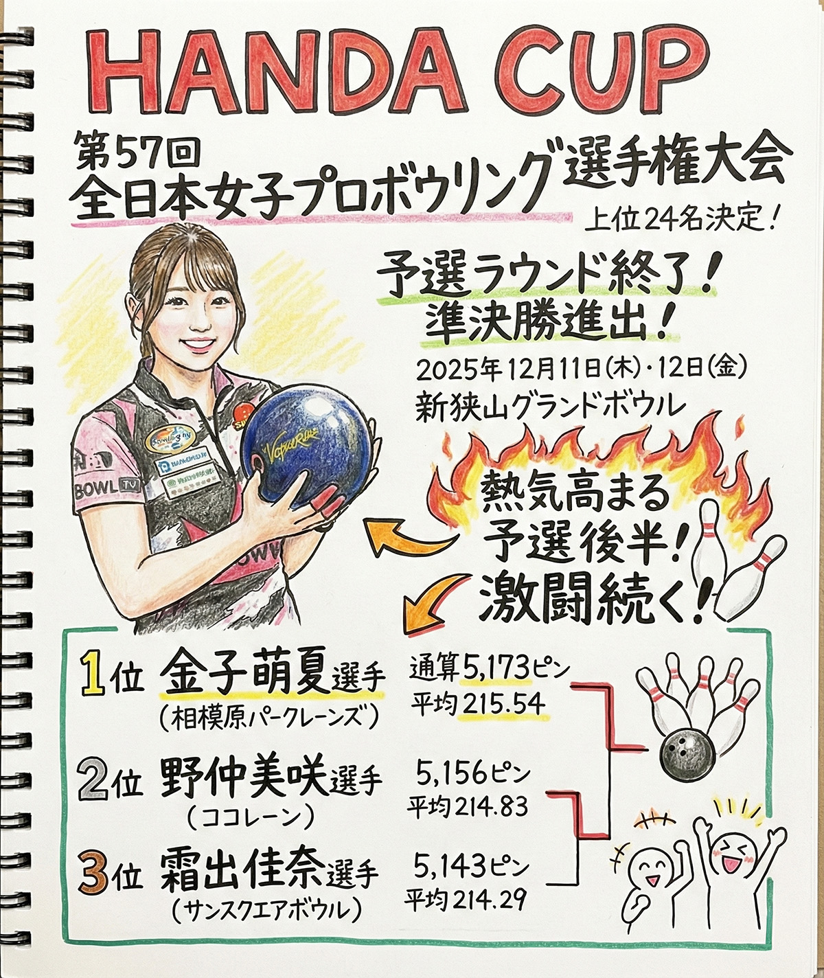 2025年12月11日(木)・12日(金)に新狭山グランドボウルで開催された「HANDA CUP・第57回全日本女子プロボウリング選手権大会」の予選ラウンドが終了し、準決勝に進出する上位24名が決定しました。