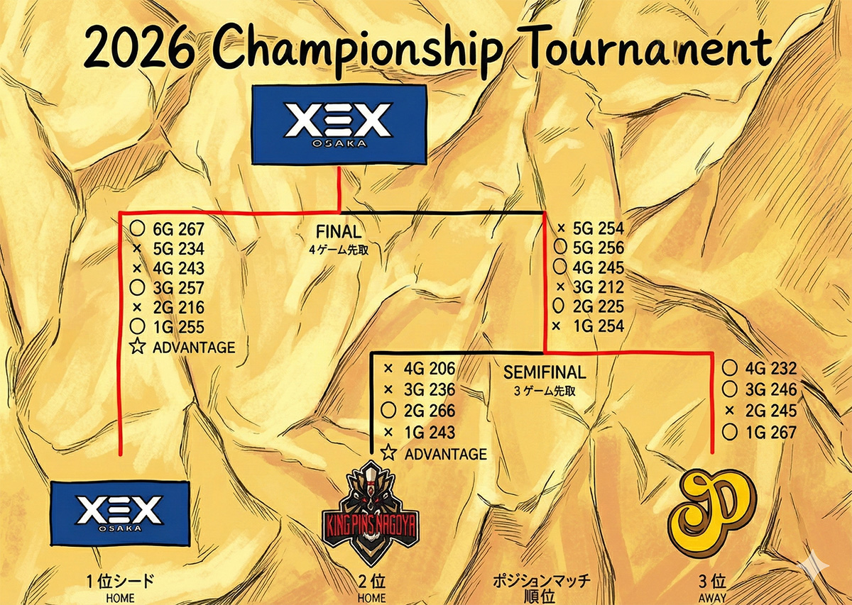 2026年のio.LEAGUEは、競技フォーマットにも工夫が施され、より見応えのある内容となりました。参加5チームによる総当たり戦を、オイルパターンを変更して2周実施。その後、上位4チームによるポジションマッチ、さらに上位3チームによる決勝トーナメントへと進む形です。