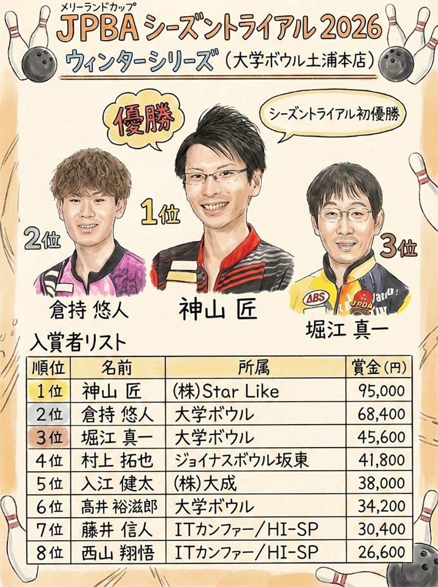 2026年1月20日(火)、茨城県土浦市の「大学ボウル土浦本店」にて、公益社団法人日本プロボウリング協会(JPBA)主催の「JPBAシーズントライアル2026 ウィンターシリーズ」が開催されました。本大会は、今季の競技力向上とランキングポイント獲得を目的とした公式戦であり、全国から実力派プロが集結しました。レーンはAMF製24L、JPBA指導のコンディション下で整備され、ハイレベルな戦いが繰り広げられました。