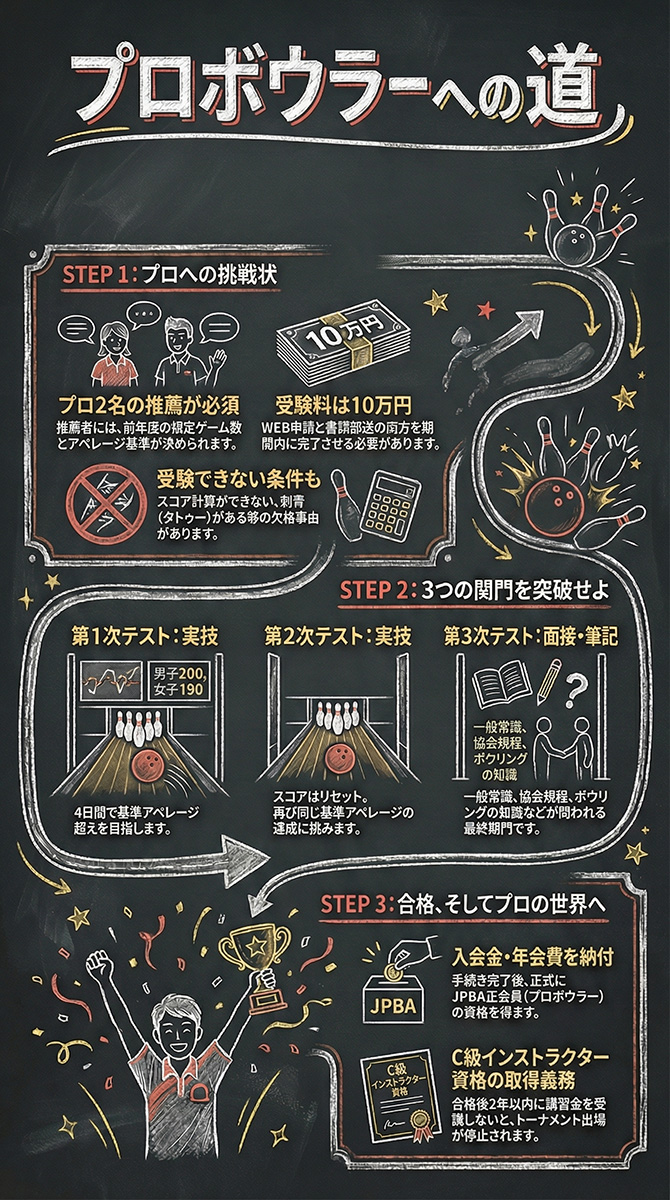 プロボウラーになるためには、このテストに合格することが必須条件であり、全国から多くのボウリング愛好者が挑戦します。