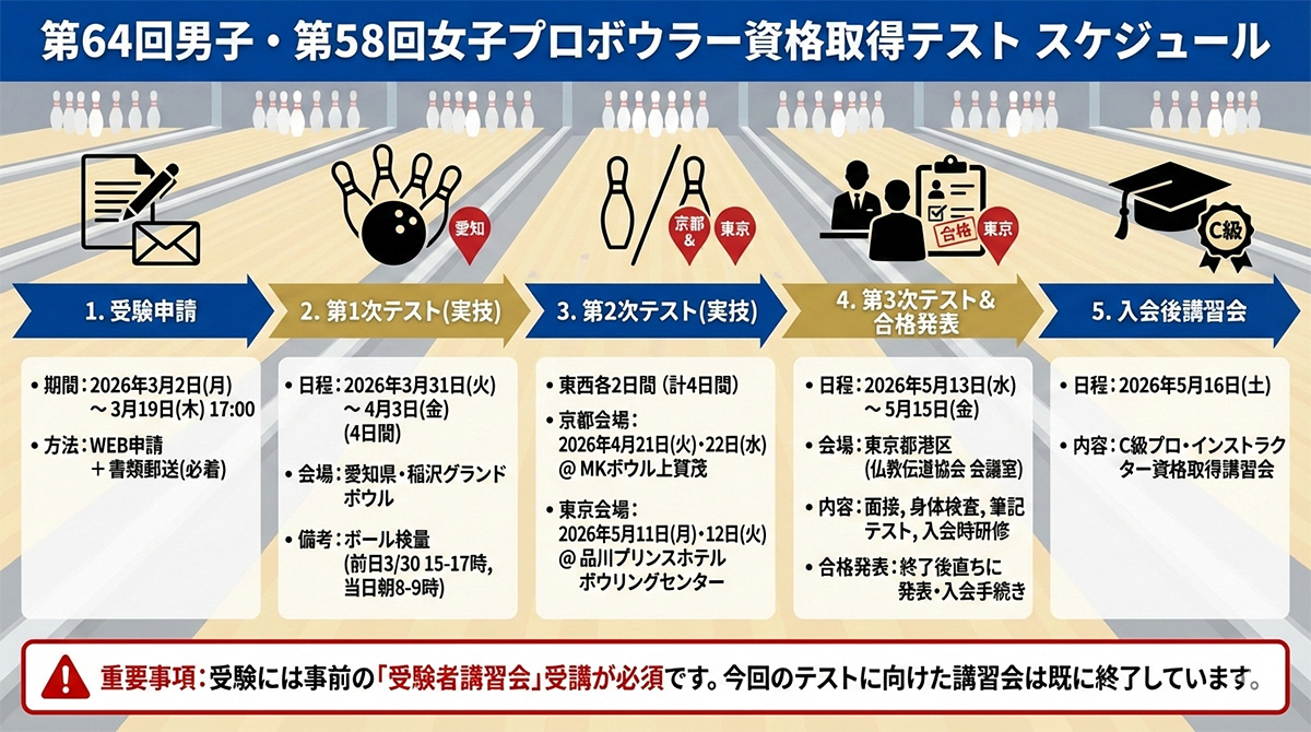 公益社団法人日本プロボウリング協会(JPBA)は、2026年度「第64回男子・第58回女子プロボウラー資格取得テスト(通称:プロテスト)」の実施要項を正式に発表しました。