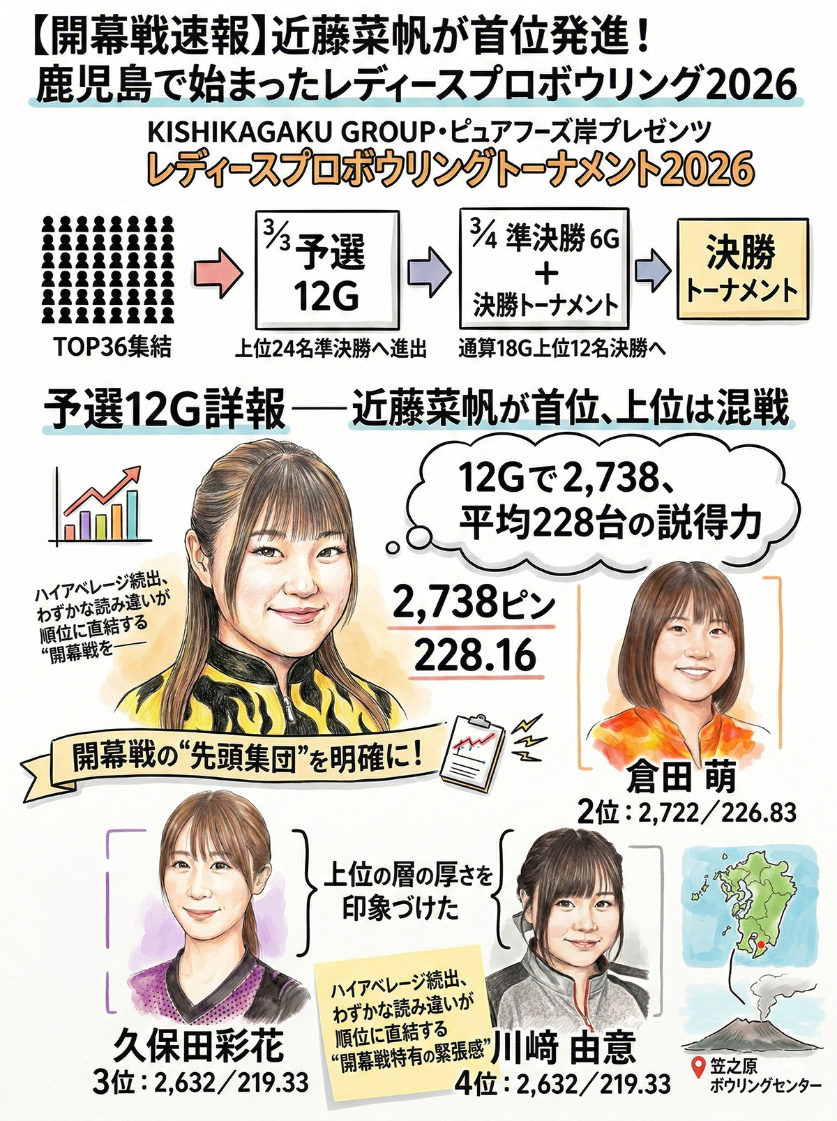 初日は確かに重要だが、決定打ではない。後半で一気に景色を変えた選手がいたように、この大会は“波をつかんだ者”が主役になれる。準決勝の6ゲームで序列は再編され、決勝トーナメントのマッチ形式ではさらにドラマが加速する。2026シーズン最初のタイトルへ向け、鹿児島のレーンは、いよいよ本当の勝負どころを迎える。