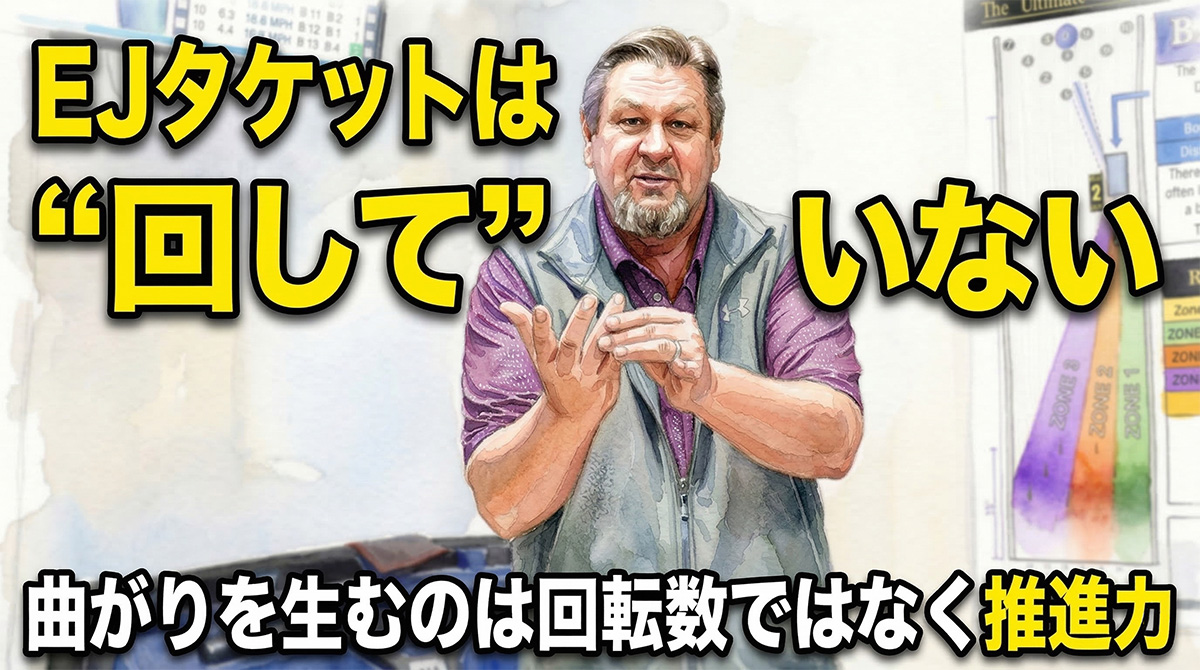 象徴的に挙げられたのがEJタケットのリリースだ。テレビで見る大きな曲がりは、多くの人に 「EJのように手首を回せば曲がる」 という誤解を生む。しかしベイカーは、EJの本質を 「手が回り込まない」、「前へ進む動きが回転より大きい」 と説明した。