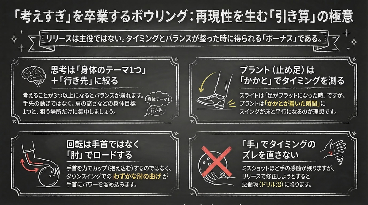 ボウリングの上達法を探すと、近年とくに目に入ってくるのが「リリース」だ。回転数、手の形、カップ、ヨーヨー……解説動画や短いクリップは無数にあり、見れば見るほど「次はこれを試そう」と思えてしまう。ところが情報が増えるほど、投球中に考えることも増える。助走の上でチェック項目が膨らみ、狙いが曖昧になり、再現性が落ちていく――そんな経験がある人は少なくないだろう。