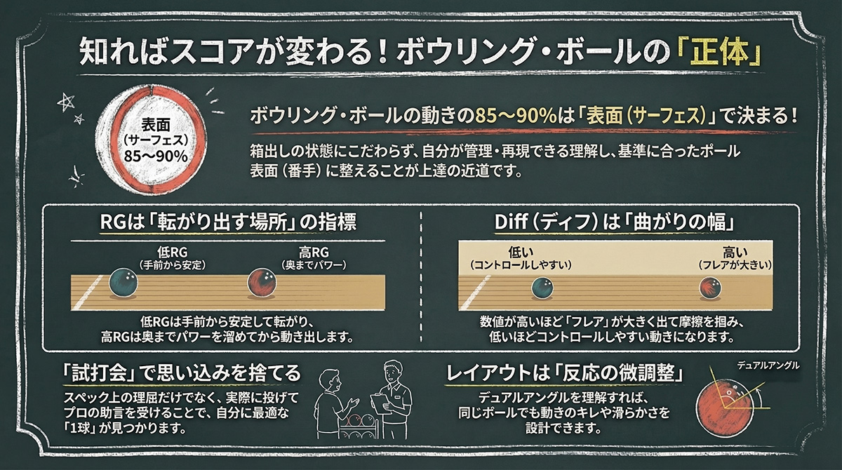 表面が“外側のつまみ”だとすれば、レイアウトは“内側の設計”だ。難しく感じても、用語を少し理解するだけで、「同じボールでも別の役割を与える」発想が可能になる。ハイスコア環境ほど、わずかな差がストライク率を左右する。その差を作るのが、表面とレイアウトの組み合わせである。