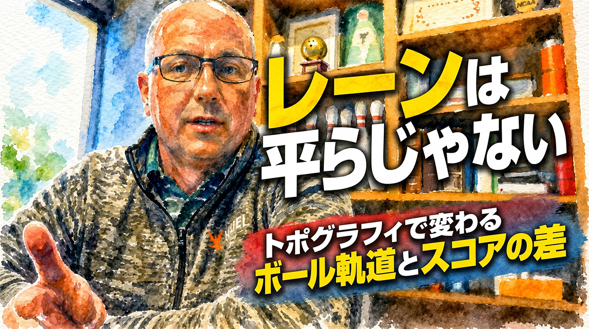 トポグラフィとは、レーンのわずかな盛り上がり(クラウン)やへこみ(ディプレッション)を指す。ダグはこれをゴルフの「グリーンを読む」感覚に例えた。ボウリングレーンも見た目は平らに見えるが、実際には「千分の一インチ」単位の差が存在し、それが重力的な影響としてボールの進路に作用する。