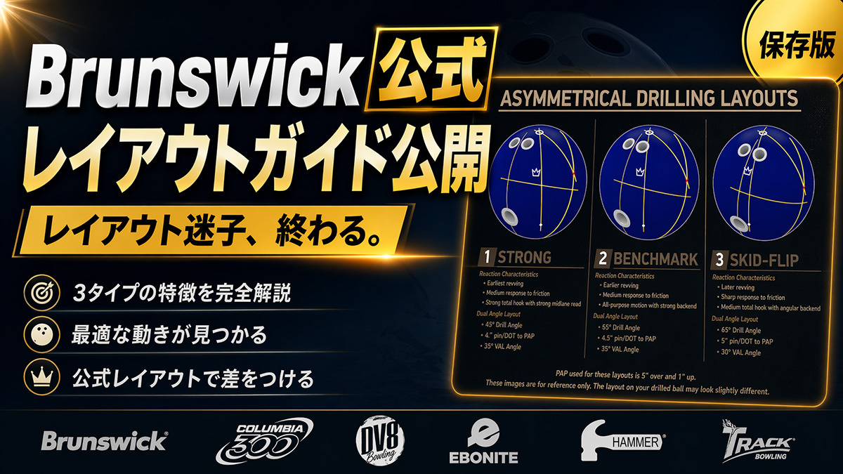 こうした状況の中でBrunswickが“公式”としてレイアウトガイドを公開した意義は大きい。非対称(アシンメトリック)と対称(シンメトリック)の分離、親指あり・親指なし(サムレス)・フルローラーまで網羅、そして現行ルールに適合。レイアウトを「誰かの流儀」ではなく共通言語として扱える土台が、ようやく整ったと言っていい。